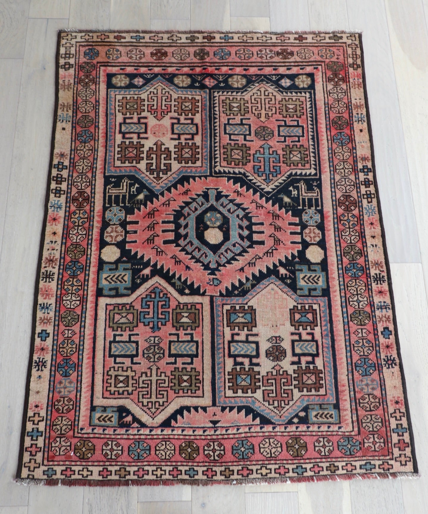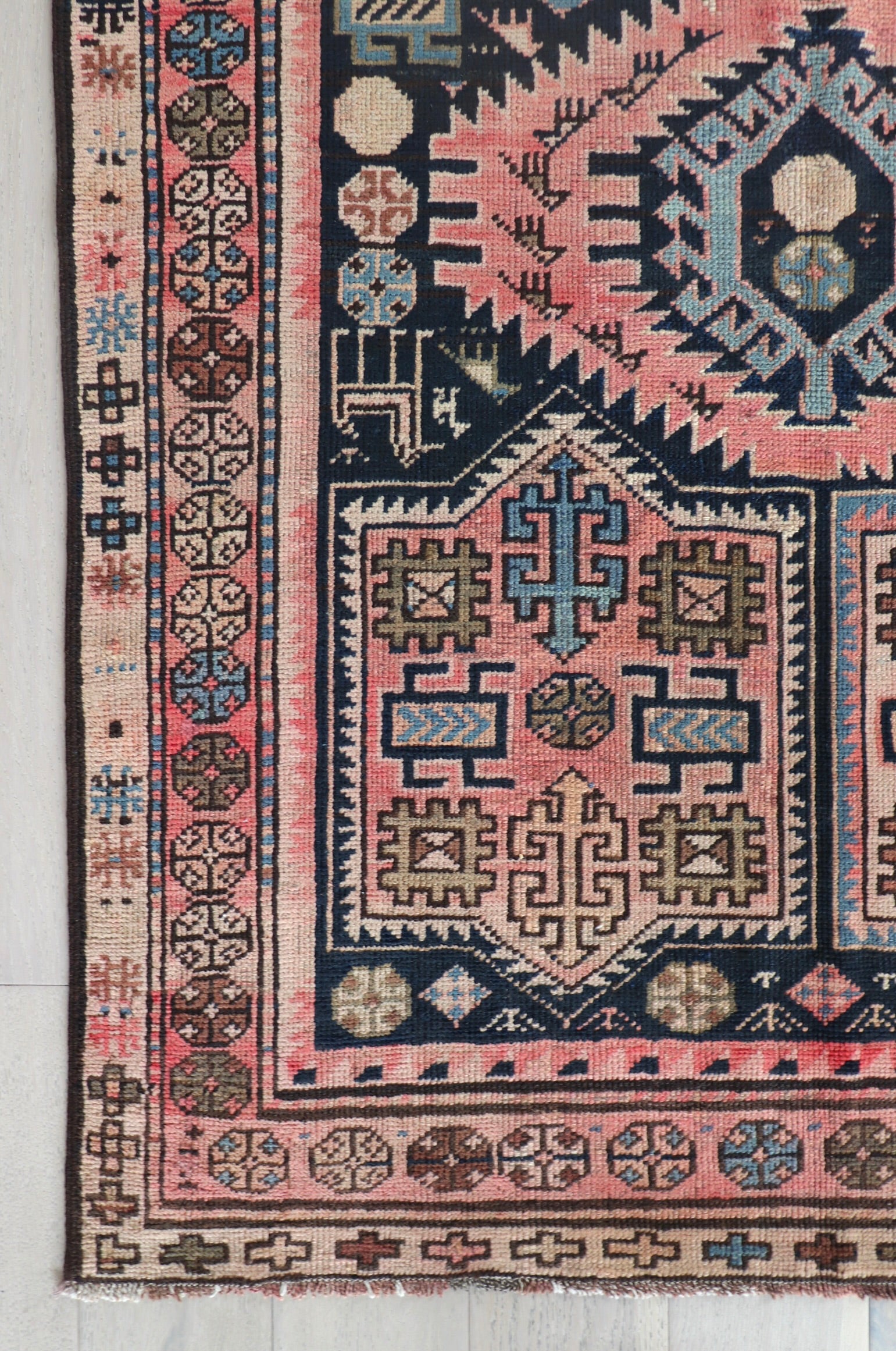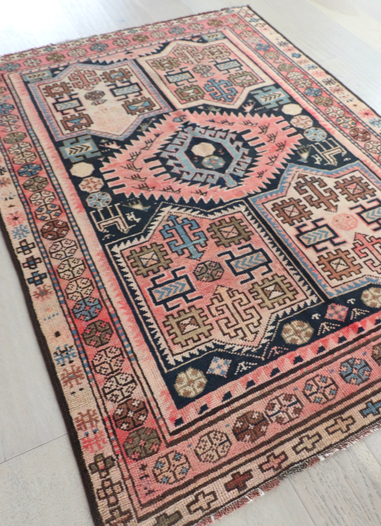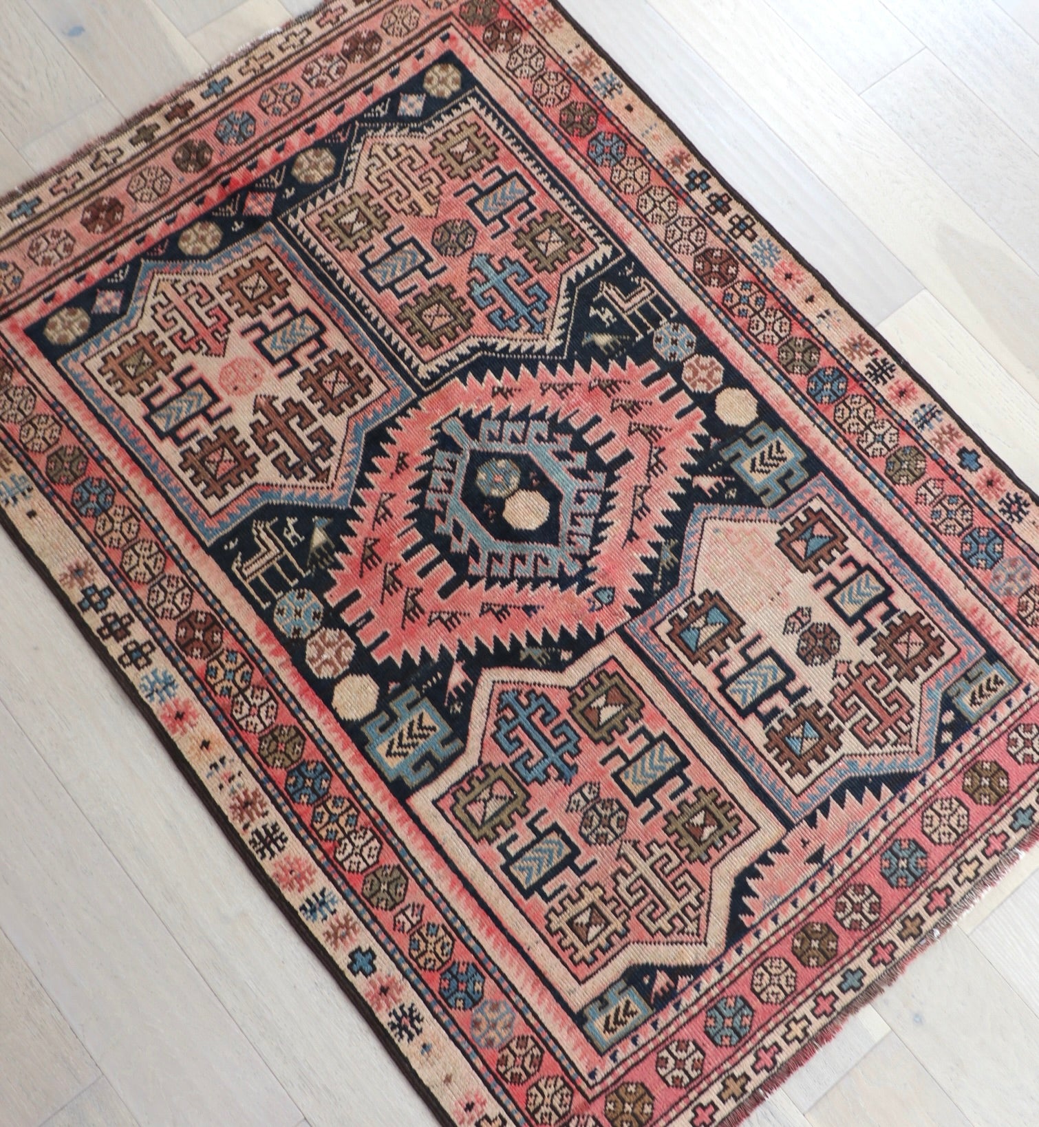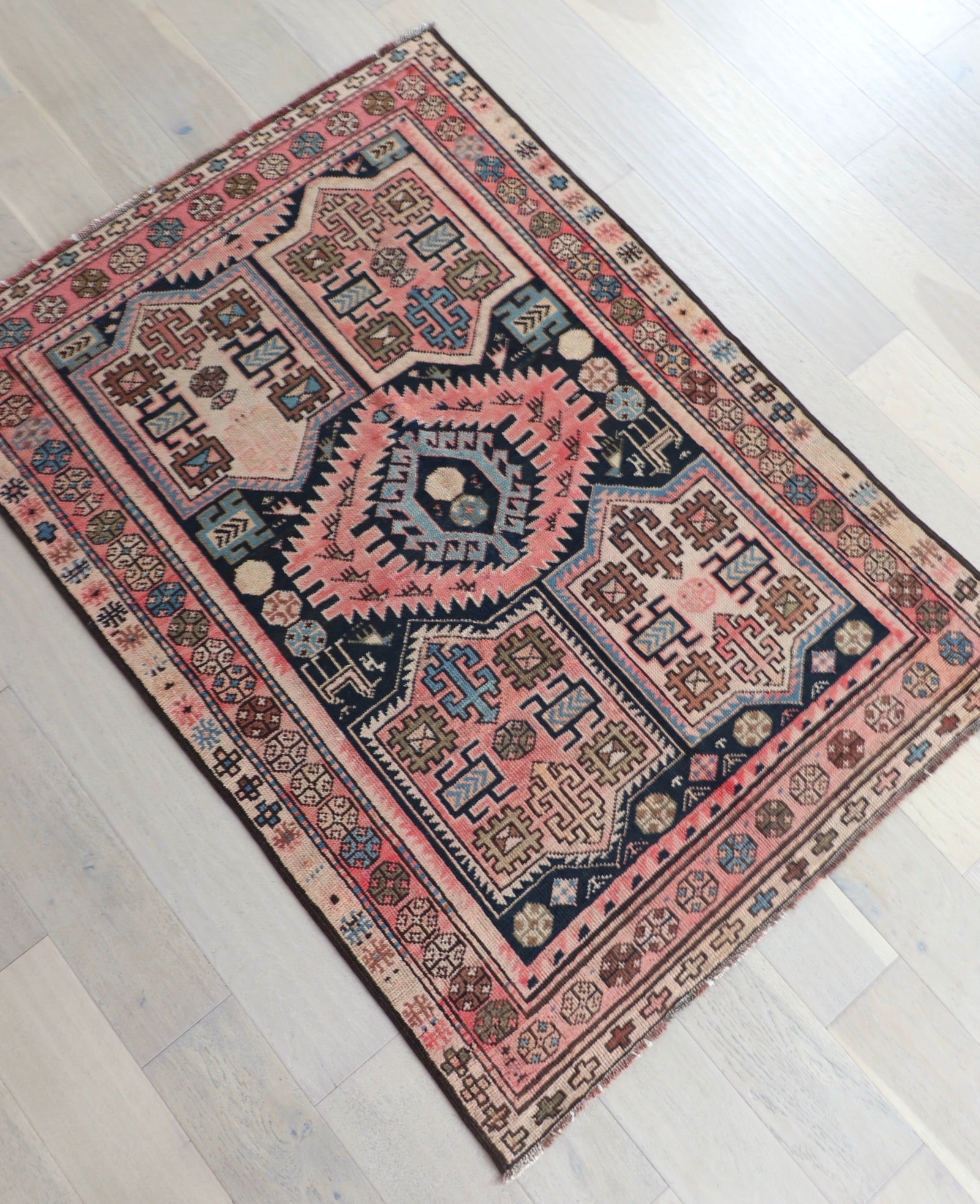 • Due to the handmade and preloved nature of these rugs, there will be imperfections and flaws that are not considered defects. We photograph our rugs indoors with solely natural light to try and show the colors as accurately as possible. All rugs are professionally cleaned.